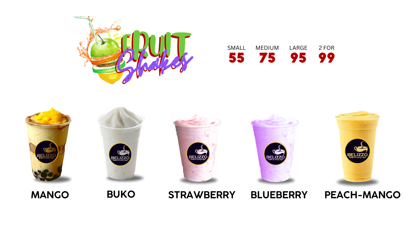 Dive into the freshness with Belizzo's Fruit Shake series – a tropical medley of ripe, handpicked fruits blended to perfection. Each sip promises a burst of Mango, Buko, Strawberry, Blueberry, or Peach-Mango flavors that transport you straight to the islands.